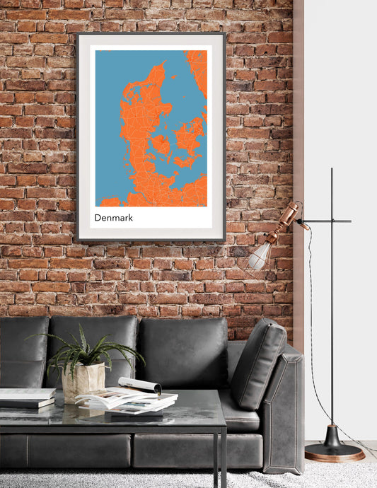Denmark orange blue print A modern minimalist map print of Quality colourful poster of on quality art paper