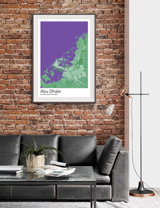 Abu Dhabi modern minimalist map print poster. A colourful poster of Abu Dhabi in United Arab Emirates on quality art paper