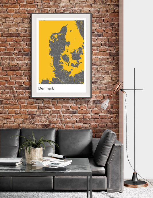 Denmark yellow print A modern minimalist map print of Quality colourful poster of on quality art paper