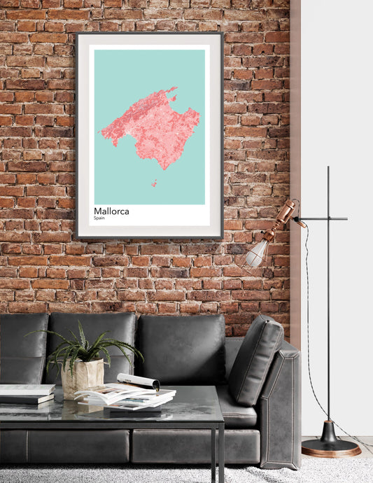 Mallorca modern minimalist map print poster. Quality colourful poster of Mallorca island in Spain on quality art paper