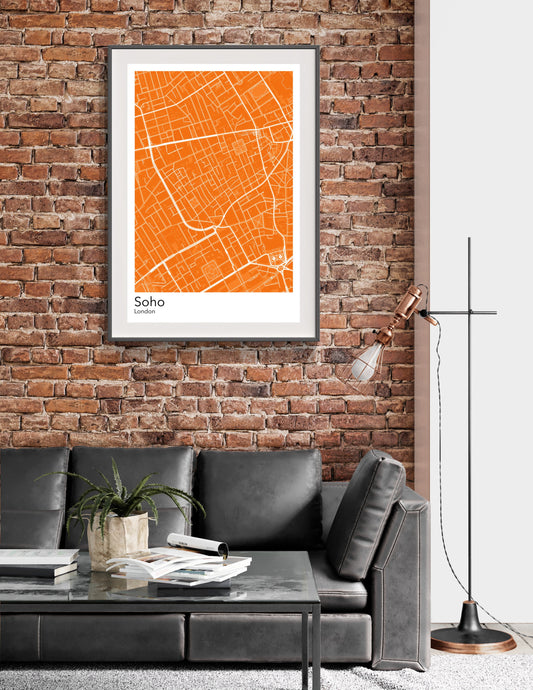 Soho in London modern minimalist map print poster. Quality colourful poster of Soho district in London on quality art paper