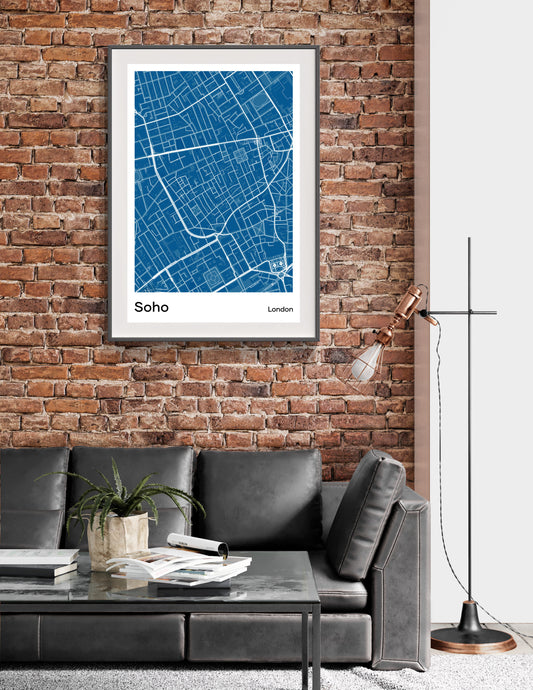Soho modern minimalist map print poster. Quality colourful poster of island of Soho in London on quality art paper