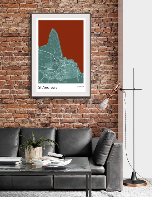 St Andrews modern minimalist map print poster. Quality colourful poster of island of St Andrews Scotland on quality art paper