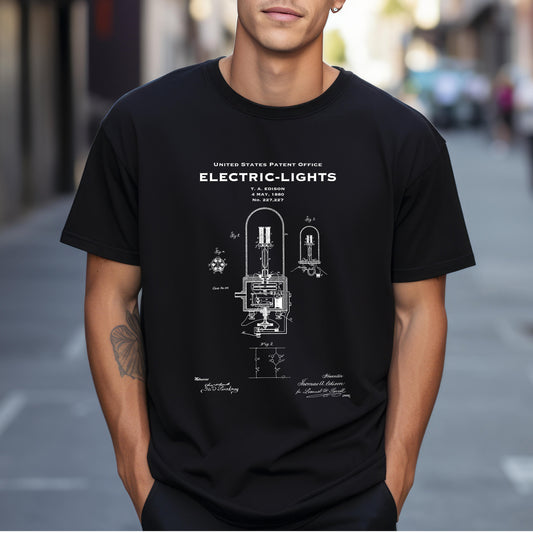 T shirt with famous patent design from 1880 for invention of electric lamp by Thomas Edison. Quality T shirt as gift for scientists