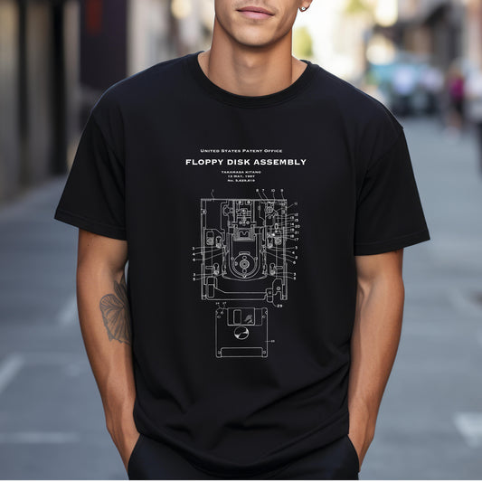 T shirt with US patent design from 1997 for the floppy disk assembly by Takamasa Kitano. Quality T shirt as gift for IT, computers, software