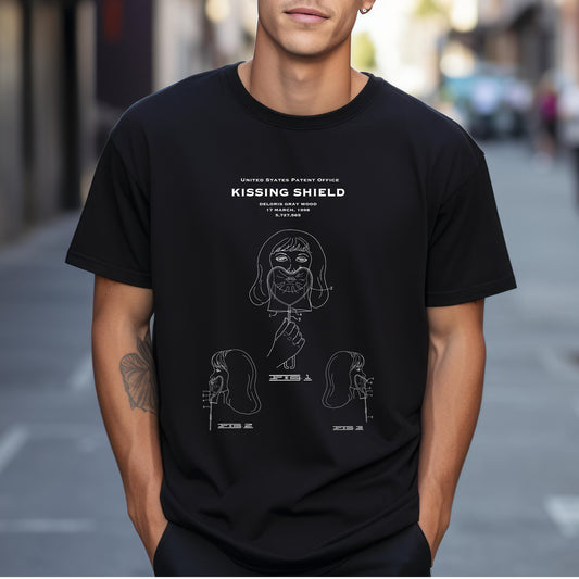 T shirt with US patent design from 1998 for a quirky kissing shield. Quality T shirt as gift for boyfriends, girlfriends, health, doctor
