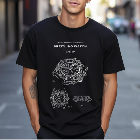 T shirt with US patent office design from 1992 of a Breitling watch. Quality T shirt as gift for watch collectors, watches lovers, fashion