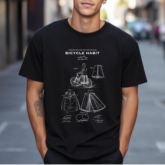 T shirt with US patent design from 1908 for quirky steampunk womens skirt for modesty cycling. Quality T shirt as gift for cyclists, cycling