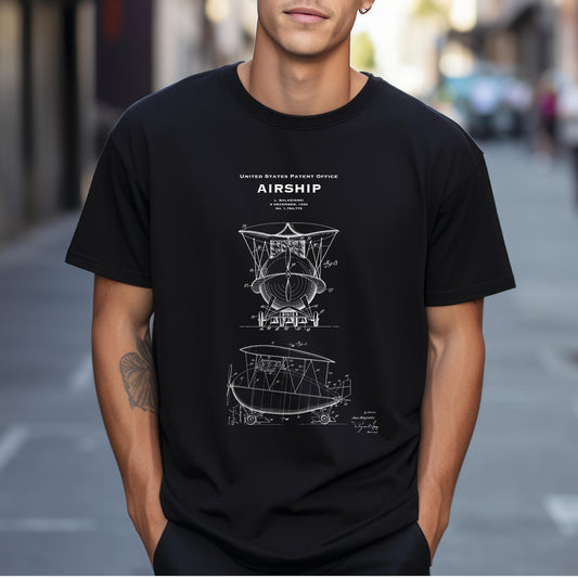 T shirt with US patent design from 1930 for a vintage steampunk airship flying machine. Quality T shirt as gift for airplane aircraft pilot