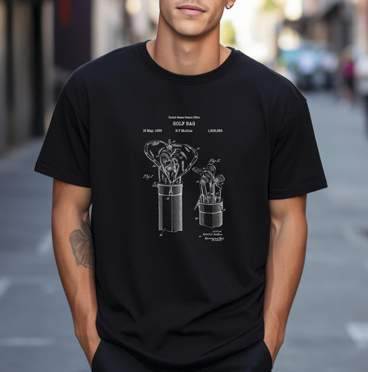 Antique golf bag design from 1933 from the US Patent Office. A quality T shirt as gift for any golfer or sport history buff