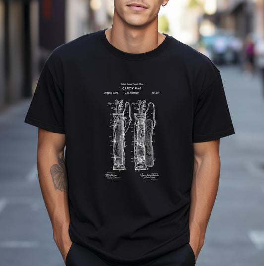 Old golf caddy bag design from 1905 and the US Patent Office. A quality T shirt as gift for any golfer or sport history buff