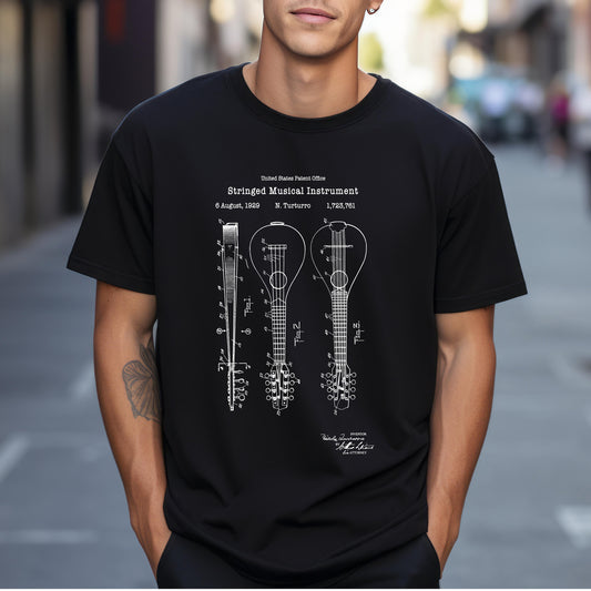 Old mandolin stringed musical instrument design from US Patent Office. A quality T shirt perfect for musicians, music lovers, players