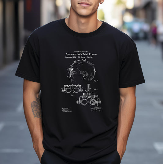 Antique optometrist trial frame design from US Patent Office. A quality T shirt perfect for opticians, optometry, ophthalmology, eyesight